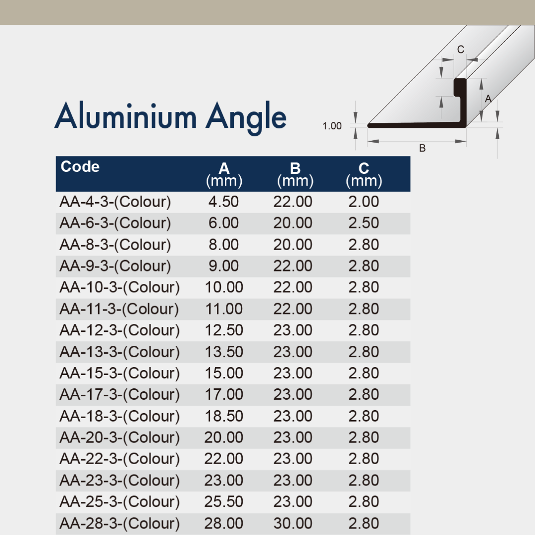 The purpose of Tiling Angles is to provide protection to the tile edge, preventing chipping and wear. Widely used, Aluminium has the flexibility of being produced in a wide range of finished and colours. This allows Tiling Angles to be utilised alongside various ceramic tiles and stones.
