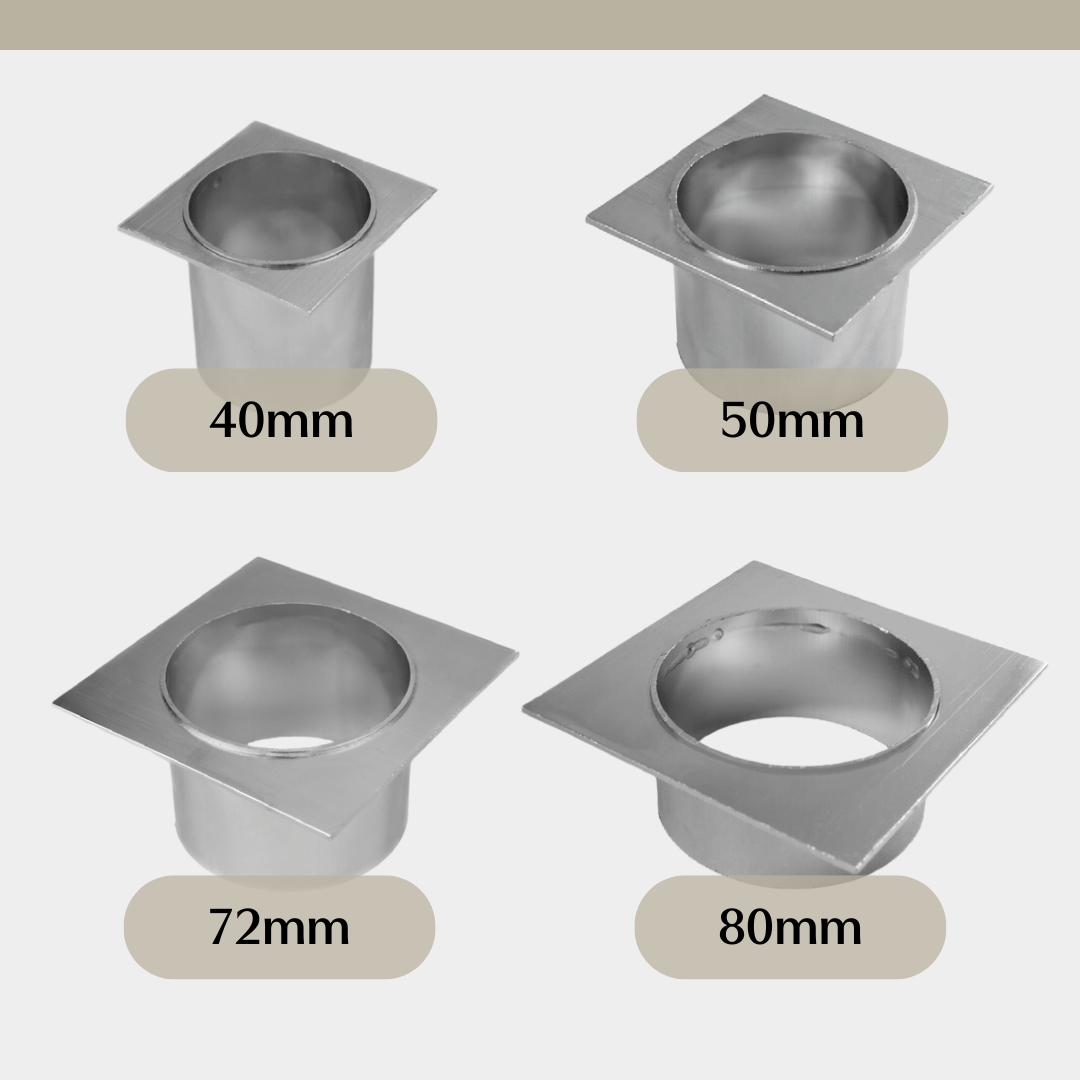 Available outlet sizes: 40mm, 50mm, 72mm, 80mm